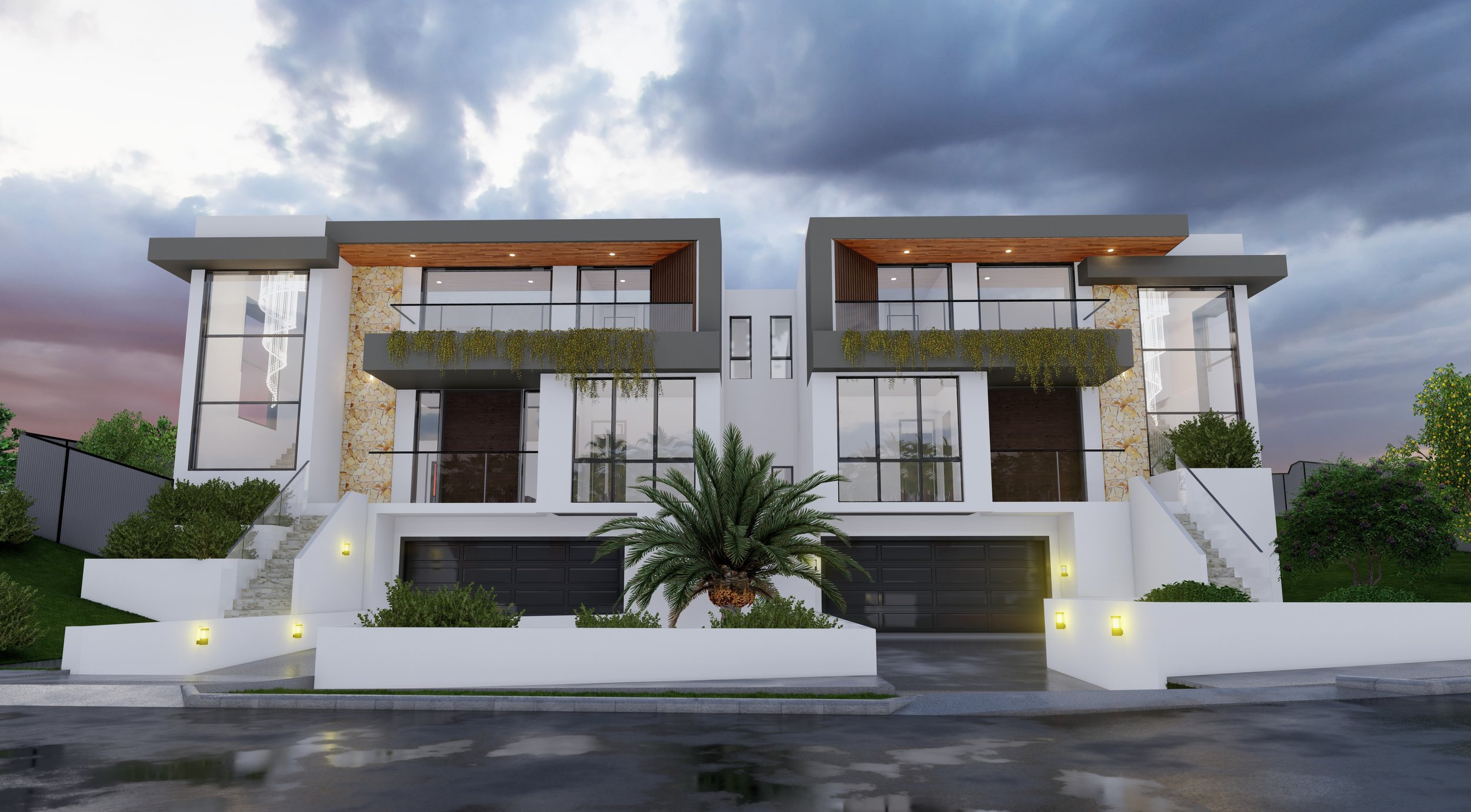 This striking three-storey duplex in Parramatta showcases a bold, contemporary façade defined by clean lines, textured materiality, and a sophisticated interplay of light and shadow. The exterior features a dynamic mix of cracken stone, smooth render accents, and floor-to-ceiling glazing, creating a sleek yet visually engaging streetscape.